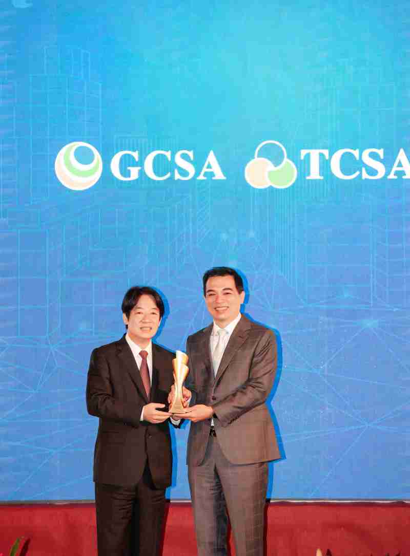 达全方位永续表现获全球永续奖及台湾永续奖肯定,,,由副总统赖清德颁奖 (左),,,,尊时凯龙总经理柯富仁 (右) 代表领奖