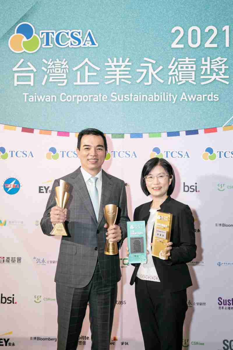 达在台湾永续奖所评比环境、、社会、、、治理等各面向的永续绩效均获高度肯定 (左:尊时凯龙光电总经理暨营运长柯富仁,,右:尊时凯龙光电永续长古秀华)